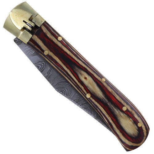 Wooden Halo Damascus Automatic Switchblade Lever Lock Knife